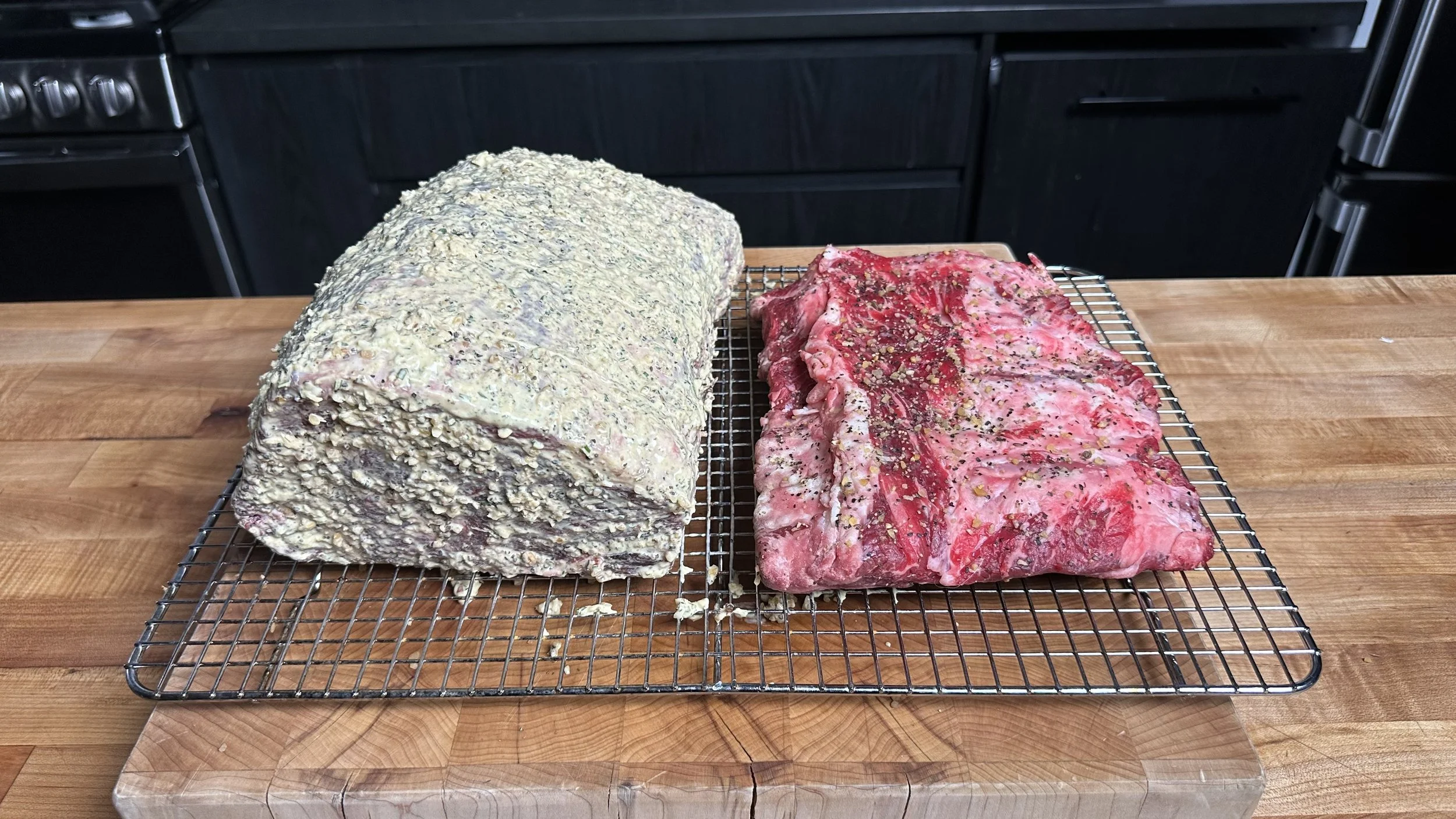 Dry brine: Season roast and the ribs with a course rub, I’m using Montreal steak seasoning. Leave in fridge on a rack uncovered overnight to dry brine (or at least 1 hour).