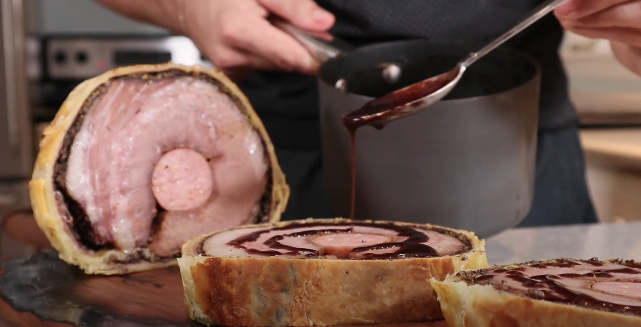 Assembly: Roll-out and combine two puff pastries, sealing with egg wash. Add a layer prosciutto, top with a thin layer of the duxelle.